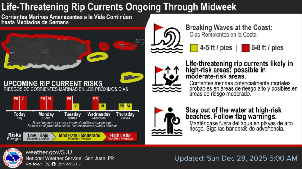 Life-threatening rip current conditions will persist through Wednesday across Puerto Rico and portions of the U.S. Virgin Islands, the National Weather Service said this morning.