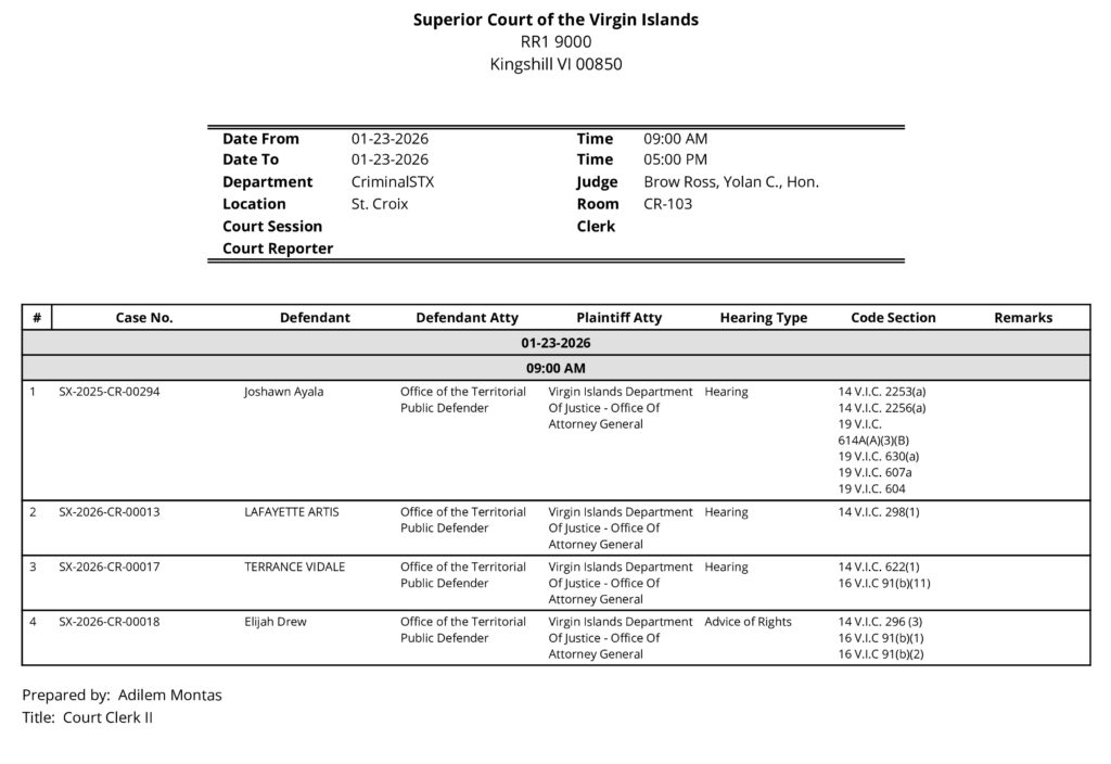 KINGSHILL — Superior Court Magistrate Judge Yolan C. Brow-Ross is scheduled to see four defendants in her courtroom in Estate Kingshill on St. Croix this morning: