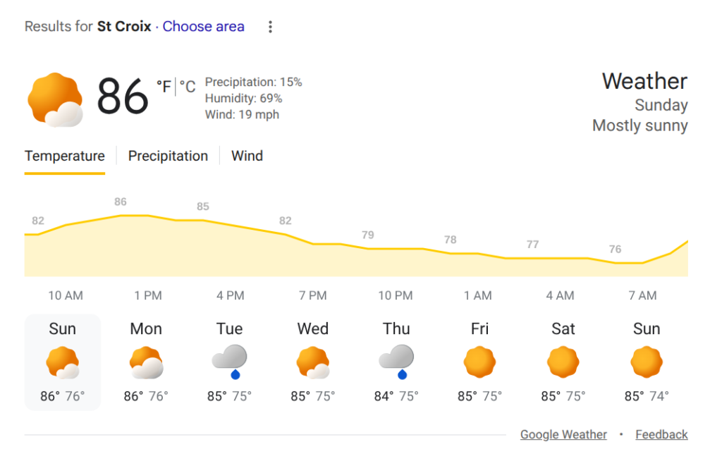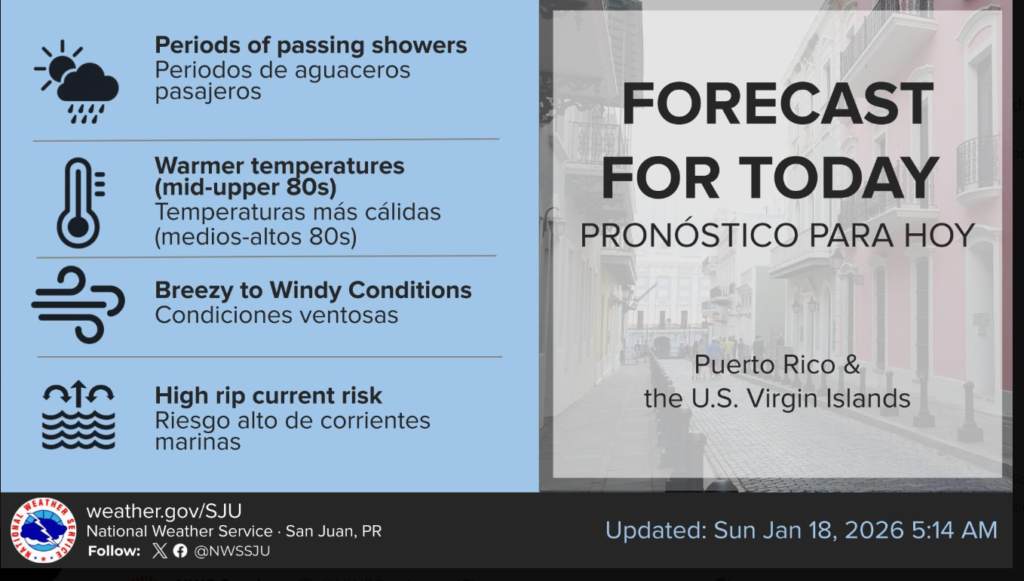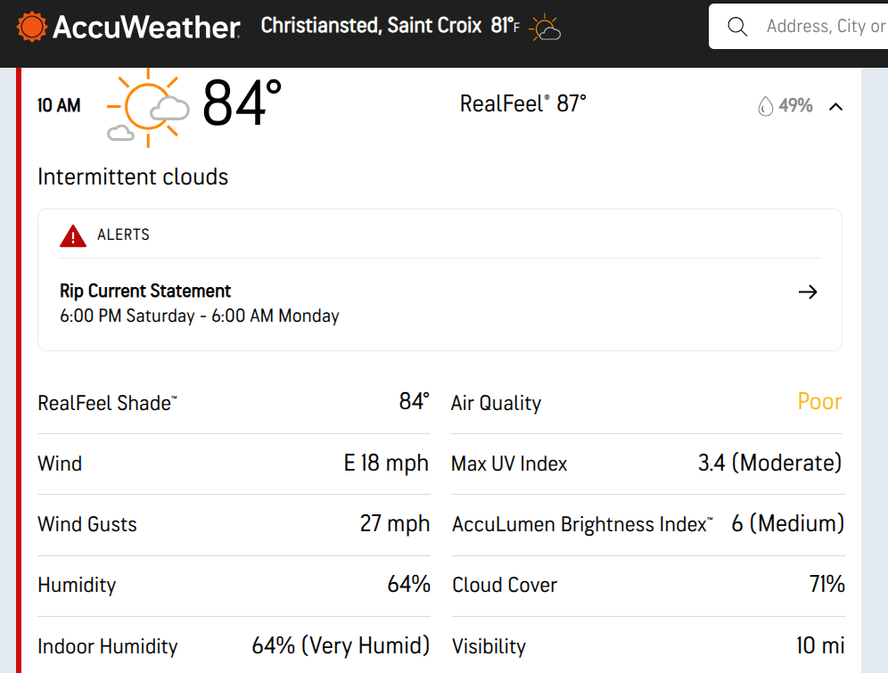 Today St. Croix will be partly sunny and windy with a shower in places this morning, high 88, AccuWeather said.
