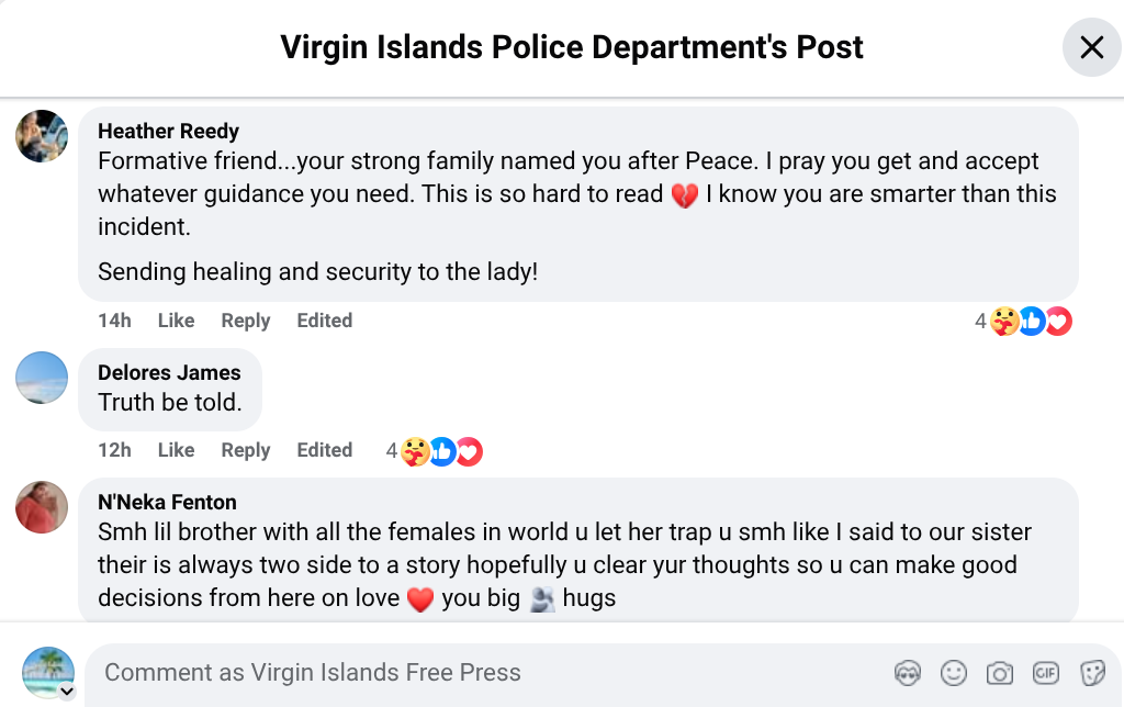 Shalom Fenton Sr., 28, was arrested and charged with second-degree assault, simple assault & battery and disturbance of the peace by fighting, all as acts of domestic violence, the Virgin Islands Police Department said.