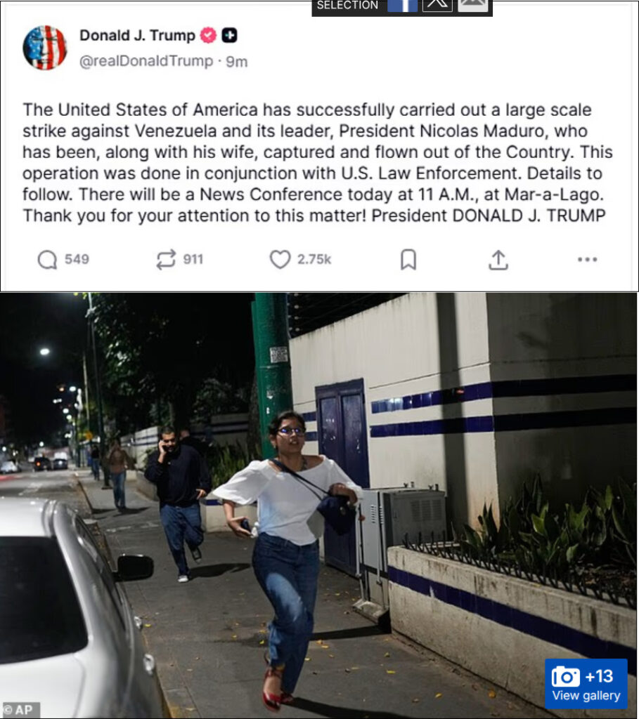 “The United States of America has successfully carried out a large scale strike against Venezuela and its leader, President Nicolas Maduro, who has been, along with his wife, captured and flown out of the country,” Trump said.