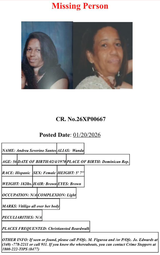 CHRISTIANSTED — The Virgin Islands Police Department is requesting the community’s assistance in locating 56-year-old Andrea Severino Santos, also known as “Wanda,” who has been reported missing in the St. Croix District.