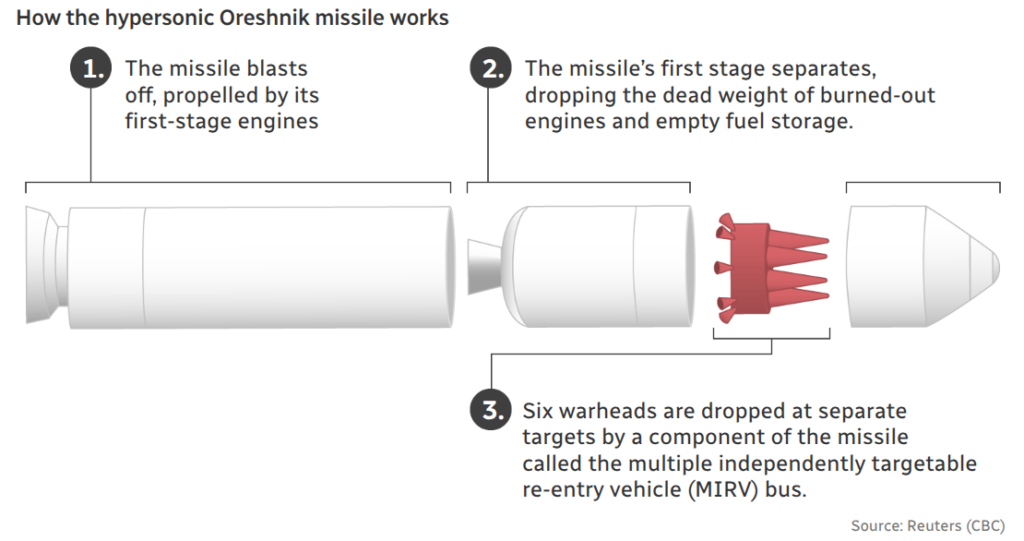 Experts say what differentiates the Oreshnik from other ballistic missiles being used by Russia against Ukraine is that it travels at hypersonic speeds and can be equipped with six warheads and submunitions which can be aimed at separate targets.