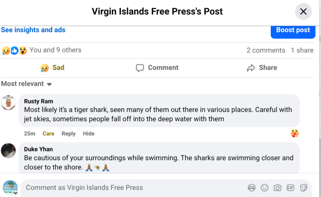 On Thursday, January 8, 2026, at approximately 4:28 p.m., the 911 Emergency Call Center received several calls of a female who was suspected to have been bitten by a shark at Dorcsh Beach, the Virgin Islands Police Department said.