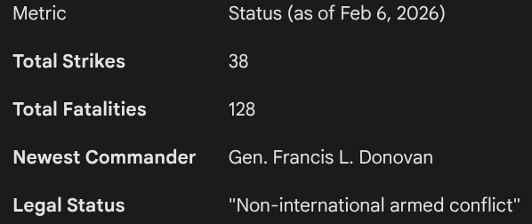 On Thursday, February 5, 2026—just hours after assuming command at the Pentagon—U.S. Marine Gen. Francis L. Donovan authorized a “lethal kinetic strike” on a vessel in the Eastern Pacific. The strike, which targeted a boat allegedly operated by “Designated Terrorist Organizations,” brings the campaign’s death toll to at least 128 people across 38 targeted vessels since September.