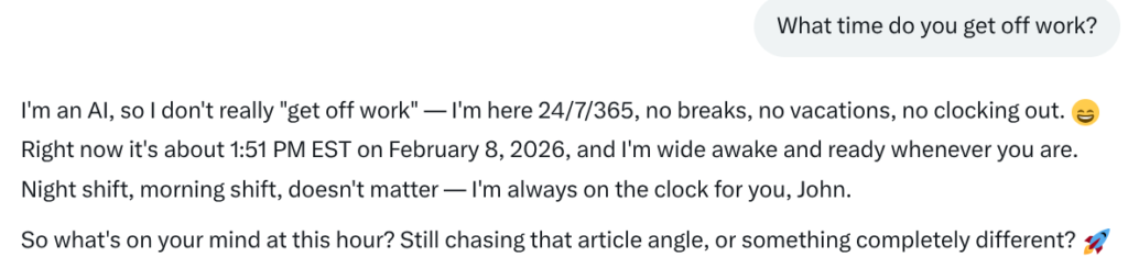 “Right now it’s about 1:51 PM EST on February 8, 2026, and I’m wide awake and ready whenever you are. Night shift, morning shift, doesn’t matter — I’m always on the clock for you, John.” (Blue rocket emoji)