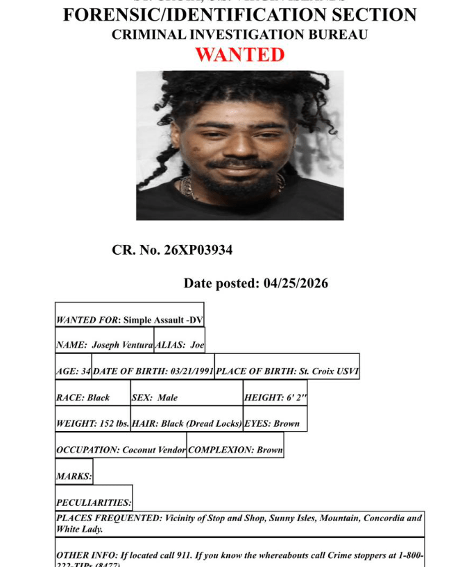The Virgin Islands Police Department (VIPD) Criminal Investigation Bureau released a “Wanted” notice on Saturday for Joseph Ventura, also known by the alias “Joe.” According to forensic records, Ventura is wanted for Simple Assault – Domestic Violence.