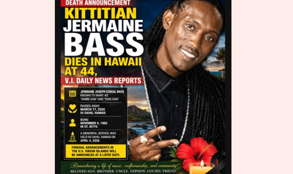 Posted onApril 24, 2026April 24, 2026inAt VIFreep, Breaking News, Caribbean News, Entertainment News, National News DEATH ANNOUNCEMENT: Kittitian-Born ‘King Dan’ Bass Dies in Hawaii at 44