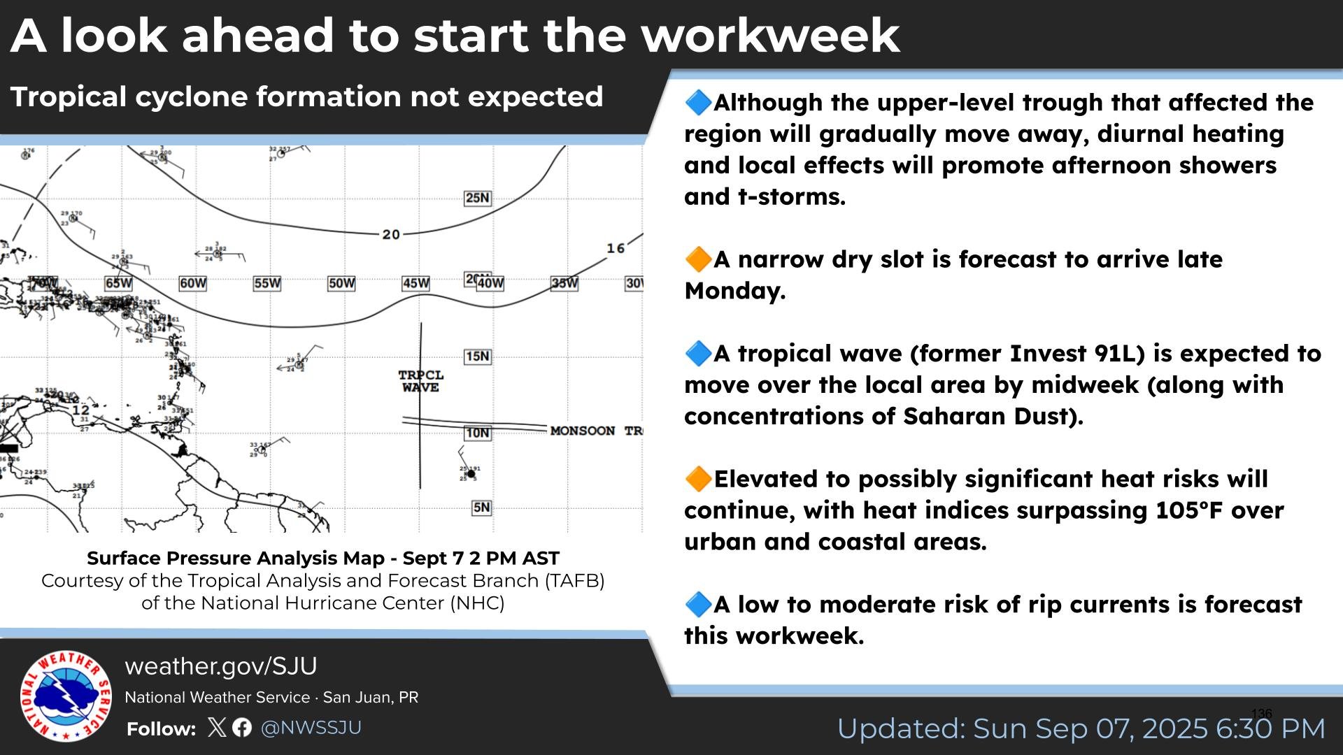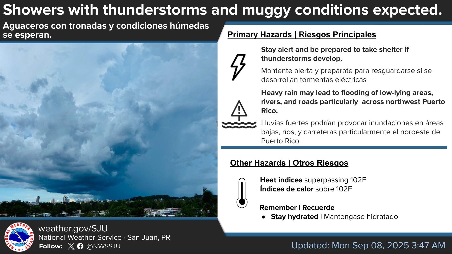 Today we can expect showers and thunderstorms with muggy heat indices, the National Weather Service said. Tonight we can expect partly cloudy conditions and a low of 76, according to AccuWeather.